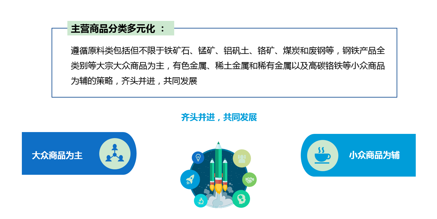 主营商品多元化:主要经营钢铁、铁矿、铁合金、煤炭和废钢等黑色金属和矿产,以及铜、铝、铅、锌、镍、稀土等有色金属及其原矿商品。